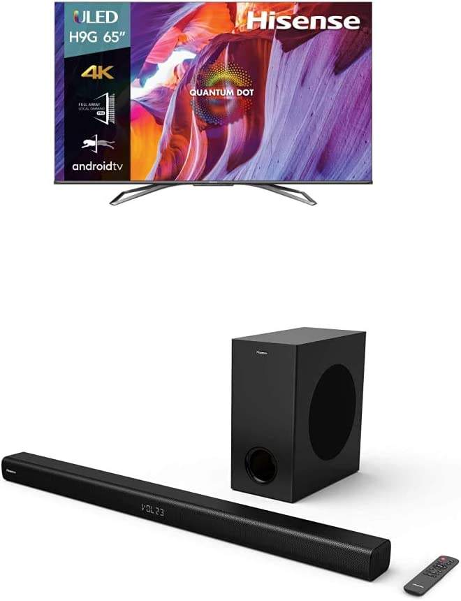 Unlock the power of over a billion colors perfectly expressed with Hisense H9G Quantum Series ULED Smart 4K TV, which combine incredible, ultra-bright 4K detail with Android TV for quick access to entertainment and ap Measures 57.1 x 33.1 x 4.1 inches, 52.7 pounds (57.1 x 35.6 x 13.6 inches with included stand, LxWxH, 55.3 pounds), the 65H9G has a 1-year manufacturer's warranty, and includes a voice remote (batteries included), power cable, and quick start guide
